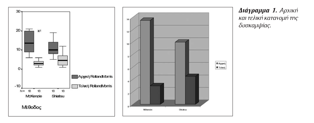 α) Υπάρχει σημαντική βελτίωση στη λειτουργικότητα και με τις δύο μεθόδους (McKenzie και Shiatsu). Με την κλίμακα μέτρησης του Rolland Morris, υπάρχει βελτίωση της λειτουργικότητας κατά 9,3 μονάδες στους ασθενείς που ακολούθησαν τη θεραπευτική μέθοδο McKenzie (από 14,10 ± 5,55 έγινε 4,80 ±5,51). Παράλληλα στους ασθενείς που ακολούθησαν τη μέθοδο Shiatsu διαπιστώνεται υποχώρηση της δυσκαμψίας κατά 5,9 μονάδες αφού από 10,90 ± 4,38 που ήταν πριν την εφαρμογή της μεθόδου μειώθηκε στο 5,00 ± 3,53. (Πίνακας 1). Παρατηρώντας παρακάτω, διαπιστώνεται ότι οι ασθενείς στην ομάδα McKenzie, ενώ αρχικά έχουν μεγαλύτερο εύρος (από 6 έως 19) σε σχέση με τους ασθενείς της ομάδας Shiatsu, στη συνέχεια μετά τις δέκα συνεδρίες και την ολοκλήρωση του προγράμματος, έχουν μεγαλύτερη βελτίωση και μικρότερο εύρος.