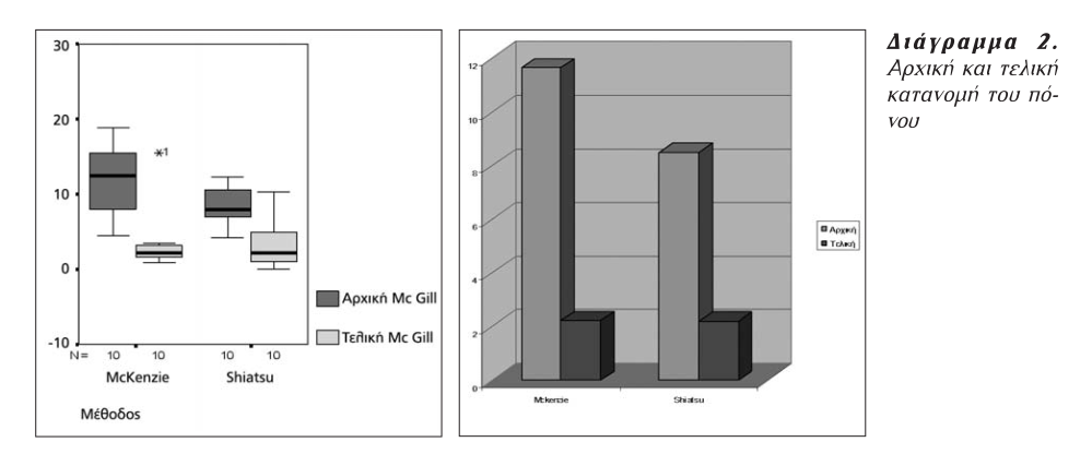 α) Όσον αφορά τη μέτρηση του πόνου με την κλίμακα - ερωτηματολόγιο McGill παρατηρείται επίσης, σημαντική βελτίωση στον πόνο όπου ο μέσος όρος από 11,64 ± 4,89 μειώθηκε στο 3,53 ± 4,31 (βελτίωση 8,11 μονάδες) στα άτομα που ακολούθησαν τη μέθοδο McKenzie, ενώ στα άτομα που συμμετείχαν στη θεραπεία με τη μέθοδο Shiatsu έχουμε βελτίωση κατά 5,08 μονάδες (από 8,49 ± 2,72 μειώθηκε στο 3,41 ± 3,28). (Πίνακας 4). Αυτές οι διαφορές είναι εμφανείς στη μέτρηση με το ερω- τηματολόγιο McGill. Η ομάδα που ανήκει στη μέθοδο McKenzie είναι με μεγαλύτερο εύρος και υψηλότερες τιμές πόνου. Μετά την ολοκλήρωση τoυ προγράμματος όμως παρατηρείται σημαντική μείωση σε όλα σχεδόν τα άτομα . Αξιοσημείωτη είναι επίσης η μείωση του πόνου και στα άτομα που ακολούθησαν τη θεραπεία με τη μέθοδο Shiatsu.